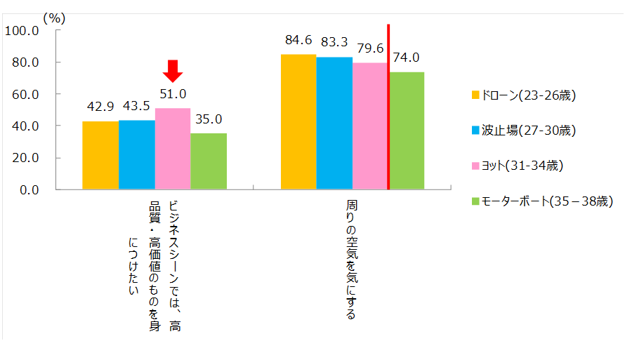 沙織(27):「ビジネスシーンでは高品質・高価値のモノを身につけたい」が高いのは、この世代ですね。これって単なるブランド信奉ではなく、資格などと同じように「誰の目で見ても確かな物」というのを重視している表れなのかも。