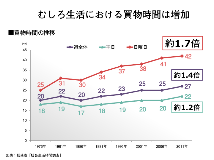 特に日曜日を見てみると1976年の25分から、2011年42分と約1.7倍に増加しています。