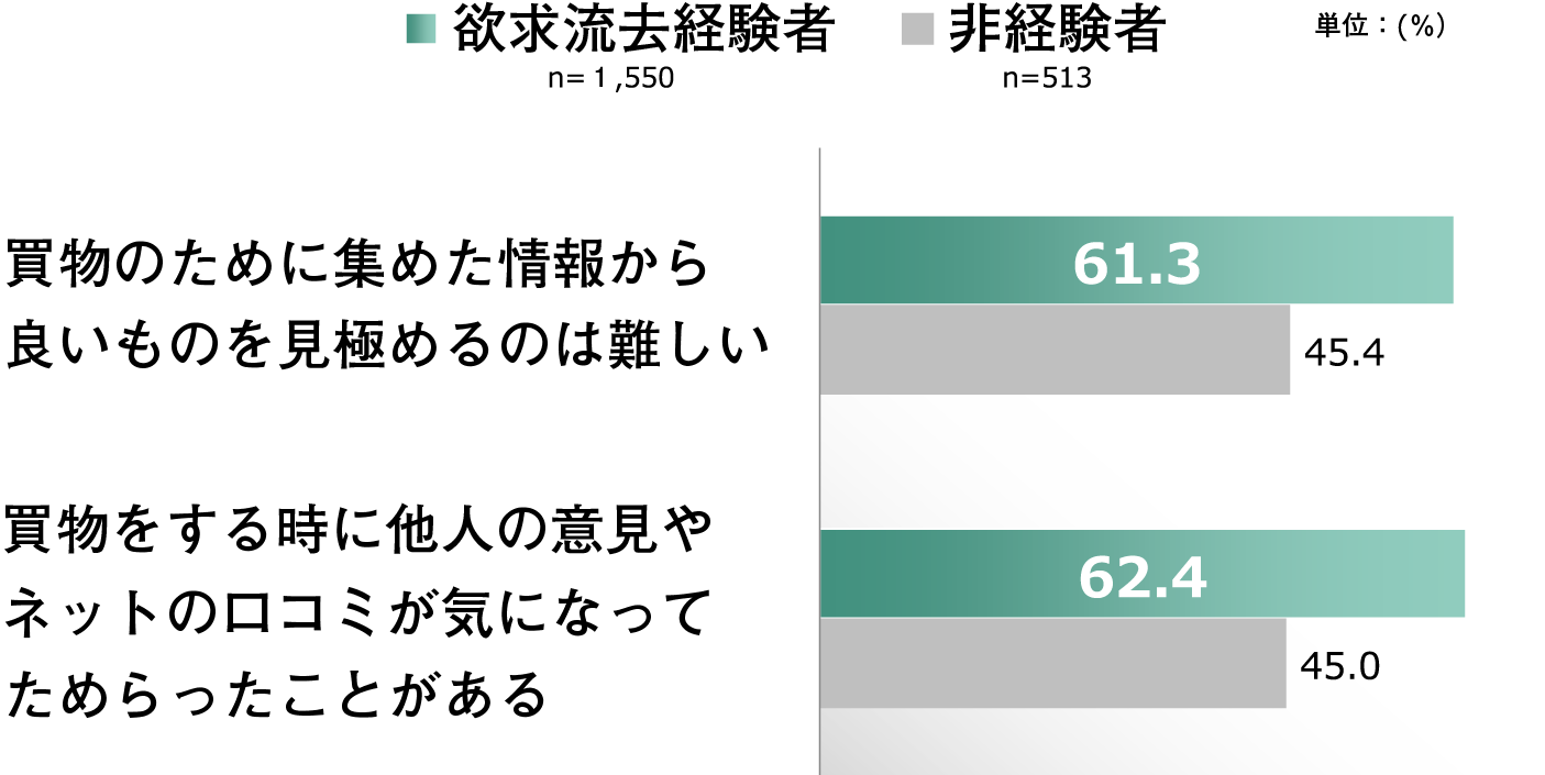 欲求流去経験者ほど「情報を見極める難しさ」「他人の意見や口コミが気になってためらった」と回答しています。