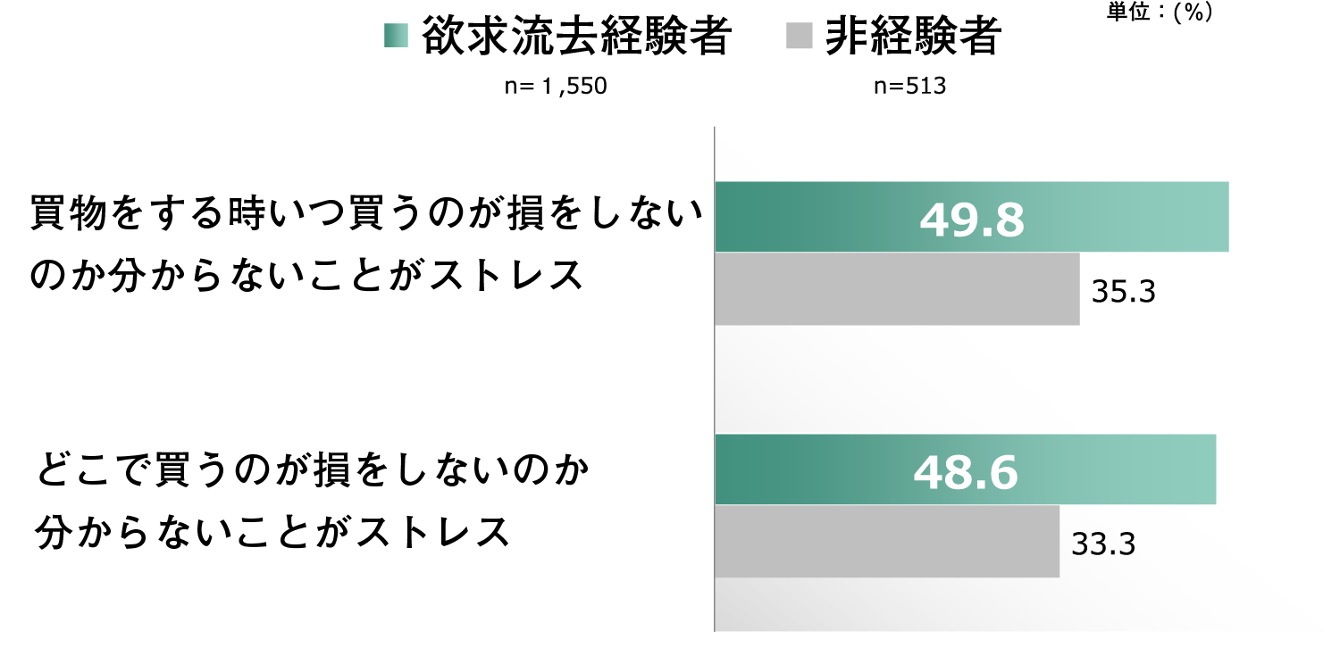 実際に欲求流去経験ほど「いつ、どこで買うのが損をしないのか?」ということに神経をとがらせ、ストレスに感じているのです。「欲しい」と思ったとしても「今じゃないかもしれない…」という思いが頭をよぎり、買物を踏みとどまらせてしまうのです。