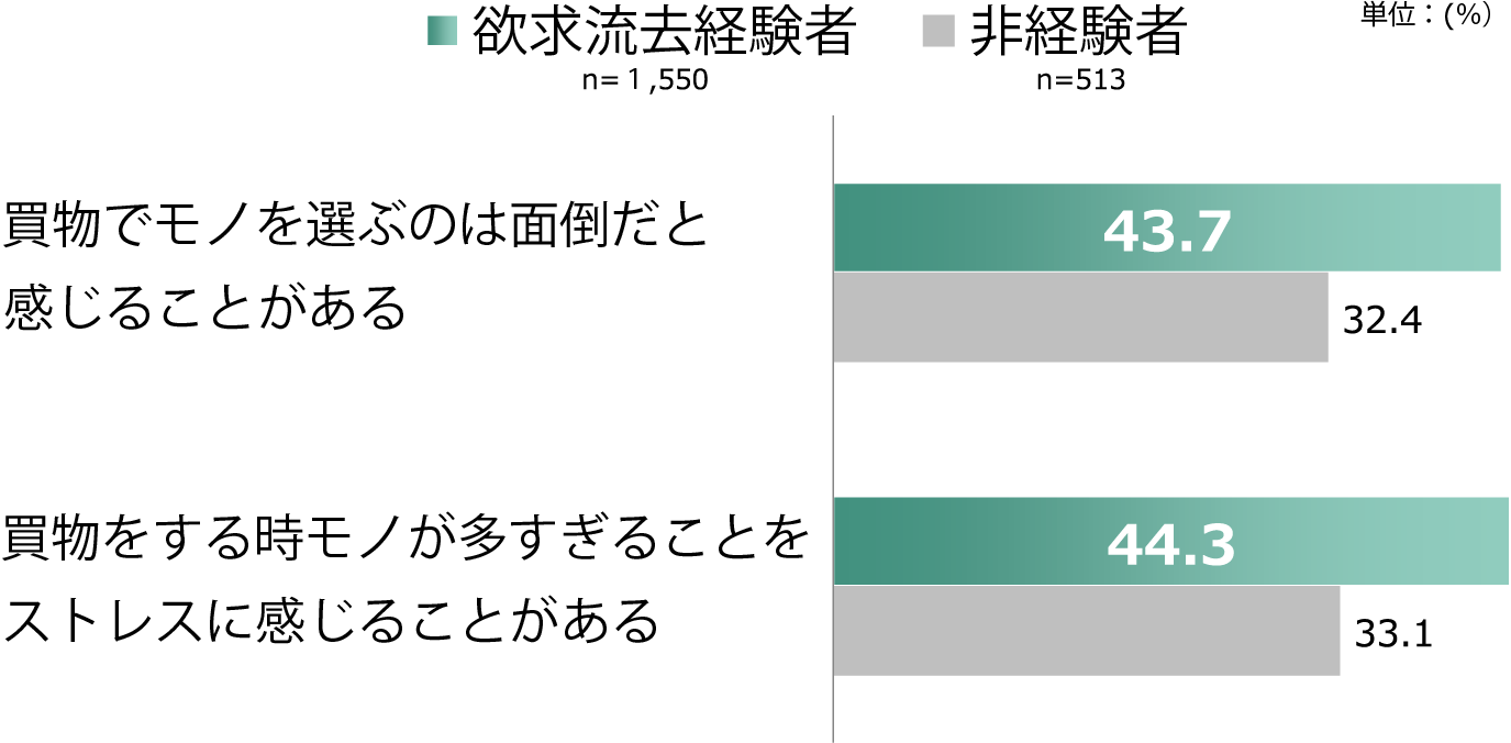 このような情報氾濫の上に、モノも溢れることで生活者は「自分にとって必要なモノ」を見失い、選べないという状況が生まれているのです。欲求流去経験者ほど「モノ選びが面倒」「モノが多すぎることがストレス」と答えていることはその表れと言えるでしょう。