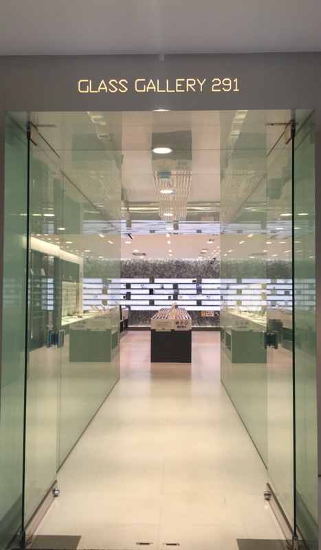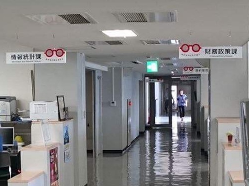 廊下のサインが、みんなめがねになっていて、壁のとけいまでめがね入りです。