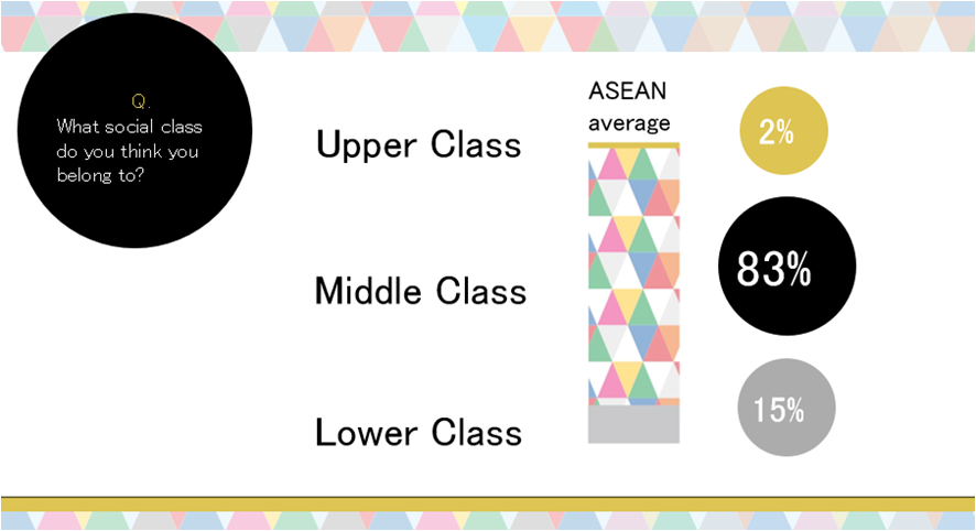 「アッパーですか?ミドルですか?下層ですか?」って直接、本人に聞いて、自称ミドルだったら、ミドルでいいんじゃないか、という調査をしました。そうすると、年収で分けると中間層は50〜60%くらいにとどまるんですけど、自意識ではアセアン全体で80〜90%くらいが自分は中間層だと思っているんです。特にベトナムは96%が中間層意識をもっているいう結果が出て。実は、これはかつて日本にもあった「一億総中流」という状態が現れているんですよね。この調査は現地からも納得してもらえましたね。