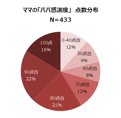 ママの“パパ感謝度”は、平均73.67点(100点満点)。約6割のママが80点以上と回答。