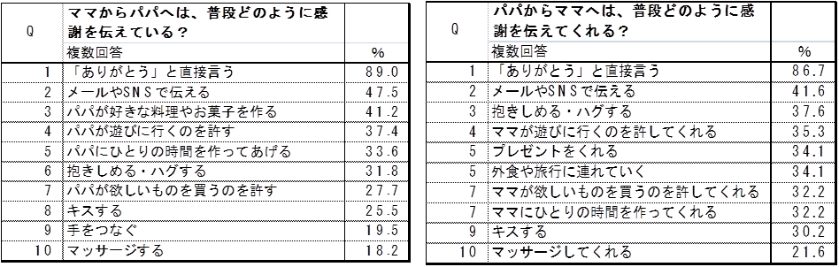 「感謝を伝えている」で男女差1割近くあるのは、やっぱりまだ一般的に家事、育児は女性がという考えからか、「ママはパパに手伝ってもらっている」、「パパはママの手伝いをしてあげている」という夫婦間の認識が根強いからなのだと思います。