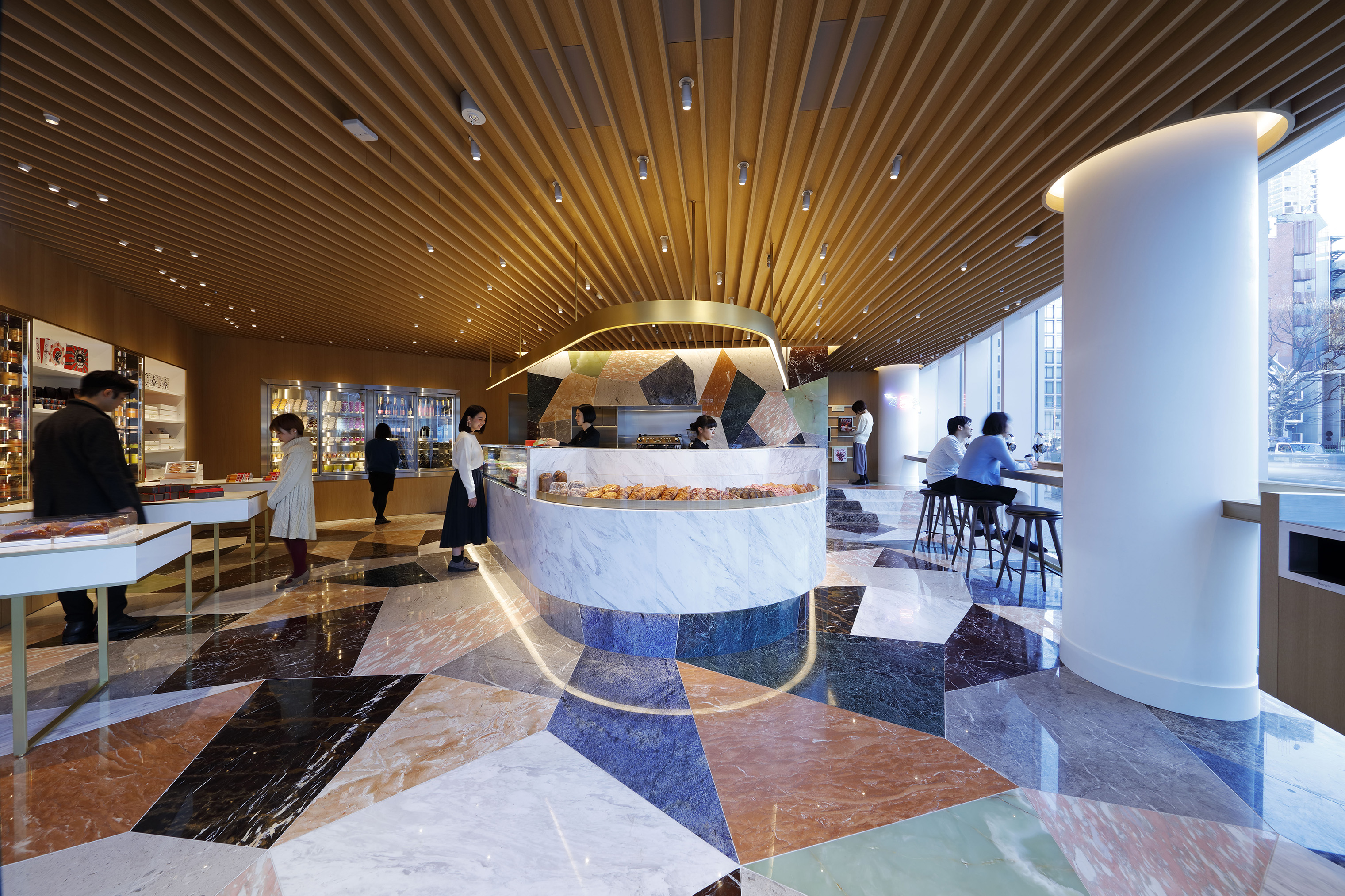 ピエール・エルメ・パリ青山では、床や壁、階段にまで さまざまな種類の大理石を全て異なる大きさや形でパターン貼りしています。この作業ですが、施工難易度は勿論の事、珍しい石種の入手や、複雑なパターンを、限られた工期の中で精度良く施工する為のリサーチ力と丁寧な施工計画が仕上がりの重要なポイントになります。