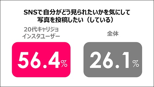 なんと、20代キャリジョインスタユーザーのうち、約半数もの人が「自分がどうみられるか」を意識した投稿をしている、あるいはしたいと考えているようです。