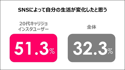 「20代キャリジョインスタユーザー」のな、なんと約半数が、「SNSによって自分の生活が変化した」(!!)と思っているそう。