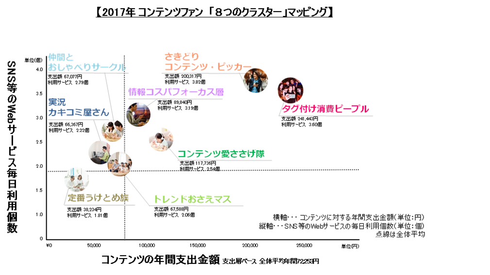 3年たった現在、そのかたまりは分化して、「コミュニケーションが活発で、支出行動も活発」というコンテンツ消費行動を牽引するような生活者群が見えてきたと言えます。彼らは“Feed”の海を自在に泳ぎ、コンテンツに対する思い入れは薄い、という点で共通しています。特定のコンテンツに熱量を捧ぐ行為よりも、「SNS内に流れる大量の“Feed”から効率よく情報をピックアップし、それに次々と反応したり支出したりすることで、コンテンツ消費を牽引する存在」となっています。