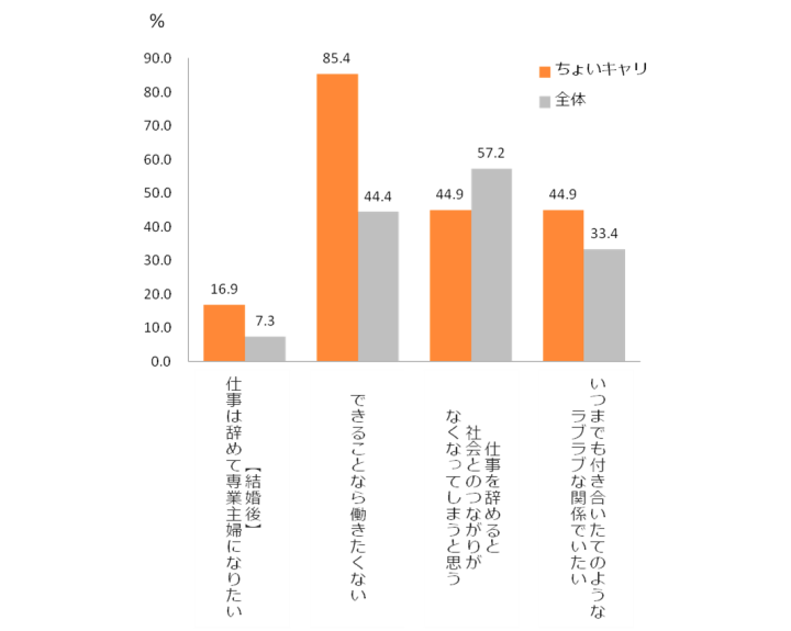 ちょいキャリさんは専業主婦願望が比較的強く(グラフ項目①)、仕事へのモチベーションが低いのが特徴です(グラフ項目②)。仕事を自分にとっての“社会との繋がり”だと捉え、重視している人は少ない模様(グラフ項目③)。彼女たちにとって、仕事はあくまで結婚までの“繋ぎ”であり、お金を稼ぐための手段なのです。