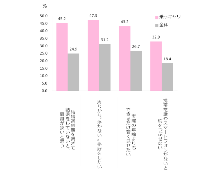 ステータスのある男性(高学歴、高収入、高身長のいわゆる三高)との結婚を夢見る乗っキャリさん。その裏には、“結婚適齢期”を強く意識しているという面があります (グラフ項目①)。周りから浮きたくない、という気持ちや(グラフ項目②)、見た目より若く見られたい!という意向も高く(グラフ項目③)、実は人からの目や世間体を一番気にしているクラスタなのです。ややスマホ依存の傾向もあり(グラフ項目④)、もしかしてかなりの寂しがり屋さんなのかも。