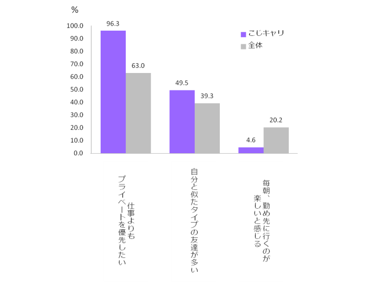 前回のコラムでご紹介した通り、仕事や恋愛・結婚への意欲がとても低く、自分の趣味にエネルギーをかけるこじキャリさん。仕事へのモチベーションが低い分、プライベートを重視し(グラフ項目①)、自分と似ているタイプの友達と過ごすのが好き(グラフ項目②)です。ただ、仕事がある日はちょっとブルーのようで、勤め先に行くのが楽しいと感じる人は全クラスターで最低値のわずか5%(グラフ項目③)。オンとオフの時間で、幸せ度数が最も偏っているクラスターだと言えます。