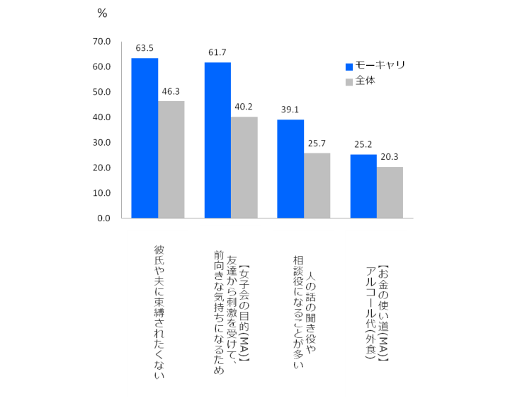 結婚していても夫に束縛されることなく、自由に自分の時間を使いたい、と考えているモーキャリさん(グラフ項目①)。女友達の集まりにポジティブな刺激を求める(グラフ項目②)というのは、仕事も趣味も人づきあいも全て頑張りたい!というこのクラスターらしい特徴ですね。友達から頼られることも多く(グラフ項目③)、外で飲むお酒に使うお金が平均よりやや高い(グラフ項目④)ことからも、社交的な面が伺えます。友達と話した後は、キャリアの面に留まらず、様々な自分磨きに燃えているのではないでしょうか。