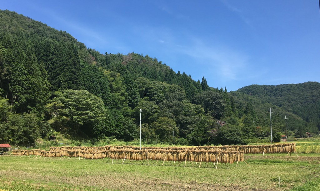 水源に向かうだけあって、緩やかにすこーし登っているこの小道・あぜみちを歩き始めると、稲刈りが終わった田んぼがひろがっていて、そこここにさっそく稲穂が干してある。お米は天日干しにすると、その美味しさはほんと格別で、機械で水分を飛ばすやり方とはなぜか違うんだな。
