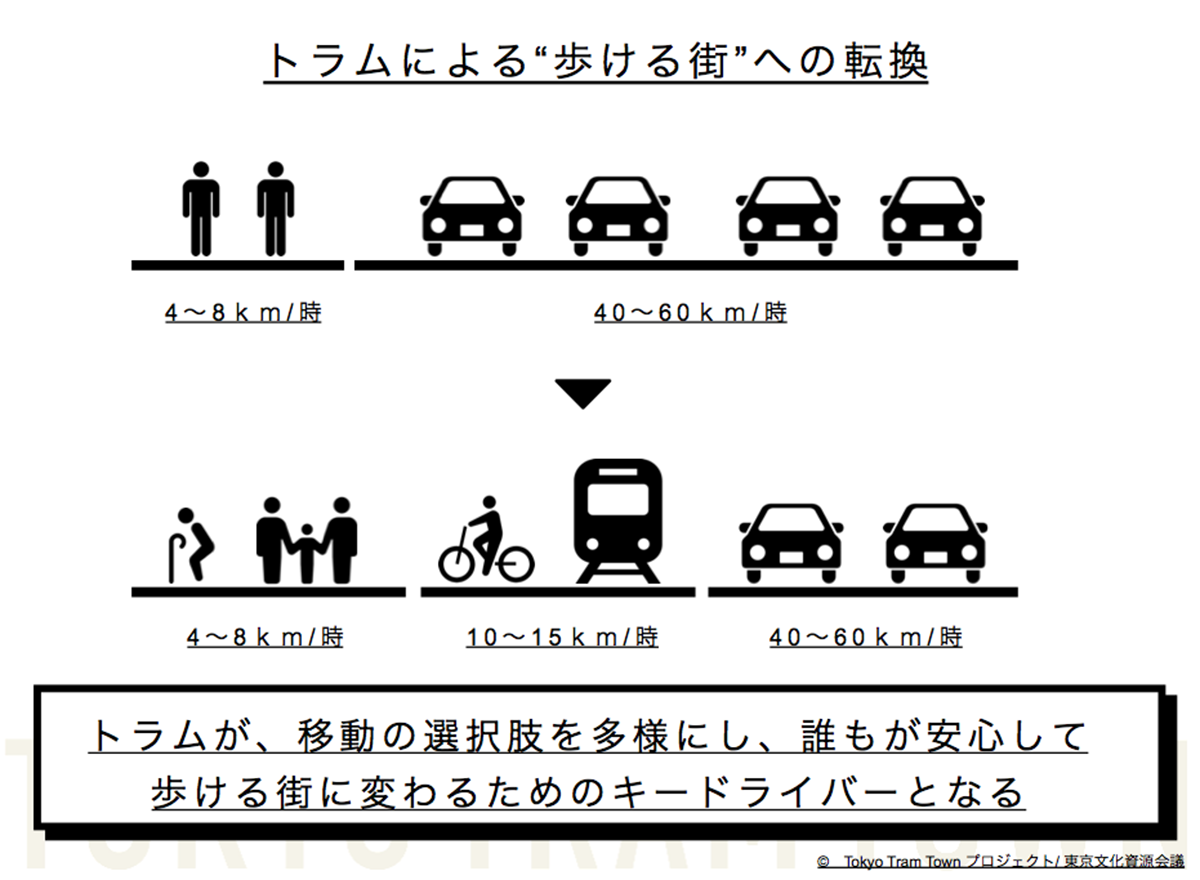 ひとつめの「都市のスピードを落とす」という提案ですが、人の移動の選択肢を多様にし、誰もが安心して「歩ける街」に変わろうという提案です。決して車や電車に対抗しようとか、交通機関同士の競争という視点ではなく、人の移動を中心にもモビリティと街とを見直すという提案です。トラムはいわばそのための触媒であり、価値転換の象徴ともいえる。