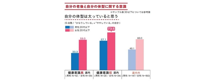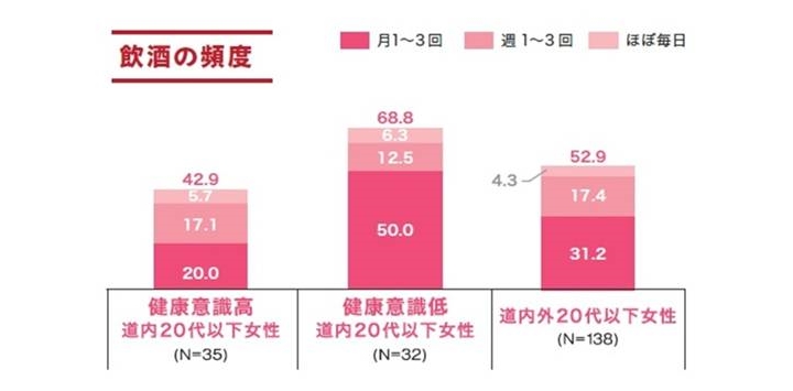 道内外20代男女に「自分の体型は太っていると思うか」を聞いたところ、健康意識高グループでみると男性は女性に比べ太っていると思う人が25ポイント以上低い結果でした。一方、女性の健康意識低グループでは7割を超える人が太っていると思うと答えました。自身の体型の評価については男性と比べてかなり厳しい道内の女性ですが、普段の食や飲酒への意識はどうなっているのでしょうか。