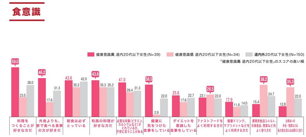 項目が高くなっていました。北海道民の健康意識は、食意識との結びつきが非常に高くなっているようです。