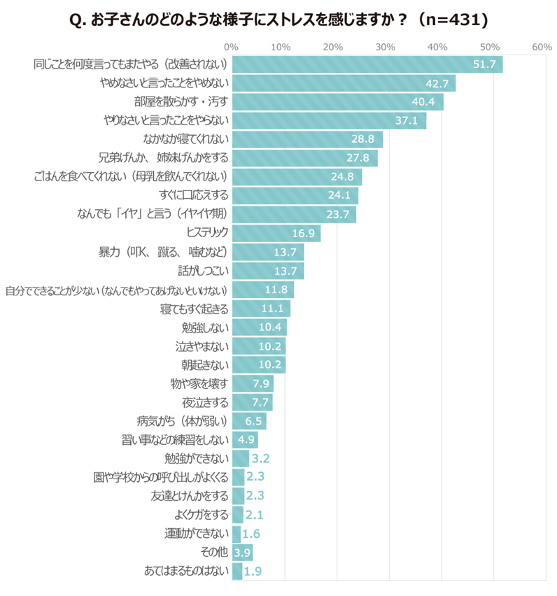 そうそう!「同じこと何度言ってもやる」「やめなさいといったことをやめない」「部屋を散らかす、よごす」はまさに非効率の極み!更には、程度の差はあれ、この3つの項目は子供だけでなく夫にも当てはまったりするので、ママのストレスはさらに倍増!となるんだと思います。