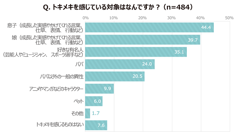 一番のトキメキ対象であったパパにトキメキを感じないということは、パパは既に“追われている日常“の一部で、“期待”や“喜び”の対象ではないんでしょうね。逆に考えると、パパの項目の中であがっている、「子どもと楽しそうに遊ぶ」「家事や育児を積極的に手伝ってくれる」という姿は、もはや“非日常“なのかもしれません。
