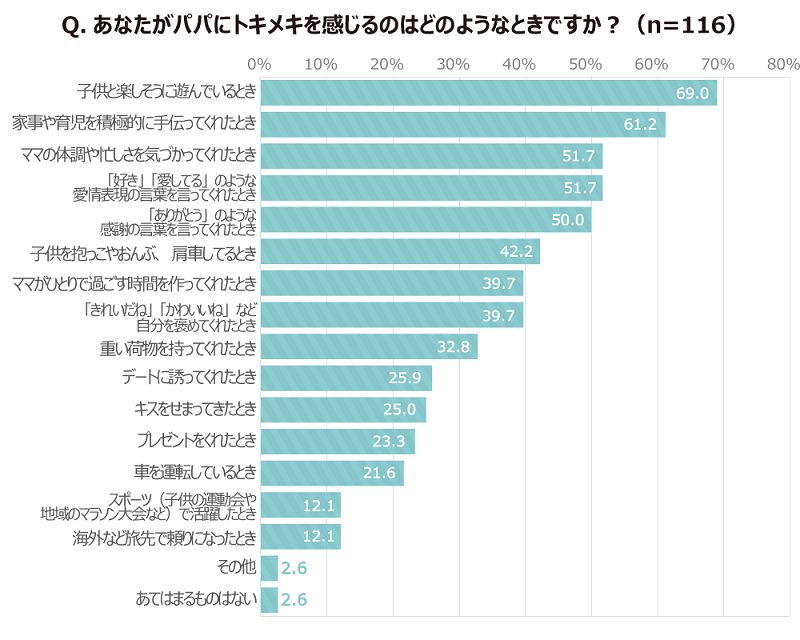 ■パパときめくのは「子どもと楽しそうに遊んでる時(69)」「家事や育児に積極的に手伝ってくれた時(31.2)」