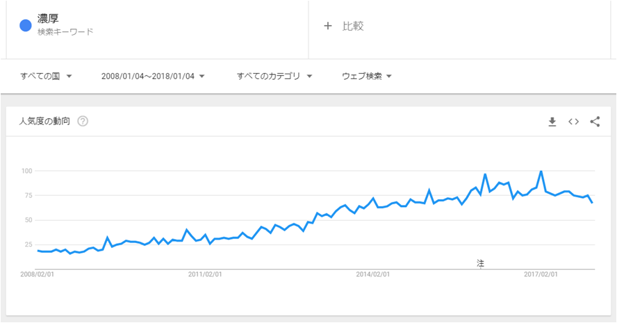 最近、「濃厚味」のお菓子や飲料をよく見かけませんか?私達が着目しているメディアでも、濃い味スイーツの記事がよく見られます。他にも、アルコール度数が高いビールやチューハイ、強炭酸など、濃さ・強さを売りにした商品が続々と出ています。実際、Googleトレンドを見ると「濃厚」の検索数はここ10年で4倍程度になっています。