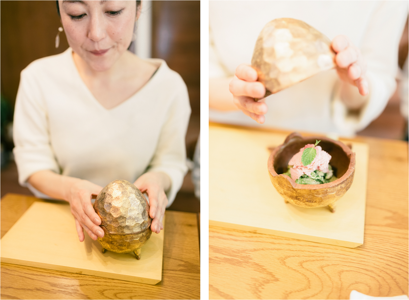 弟・洋二:カフェの器や料理は、担当いただいている料理家の方と一から一緒に相談してつくっています。うちは工房があり、その場で一から作ることできるのが強みなので。例えば、ここにしかない感動を提供したいと作ったのがこの玉手箱型の容器です。