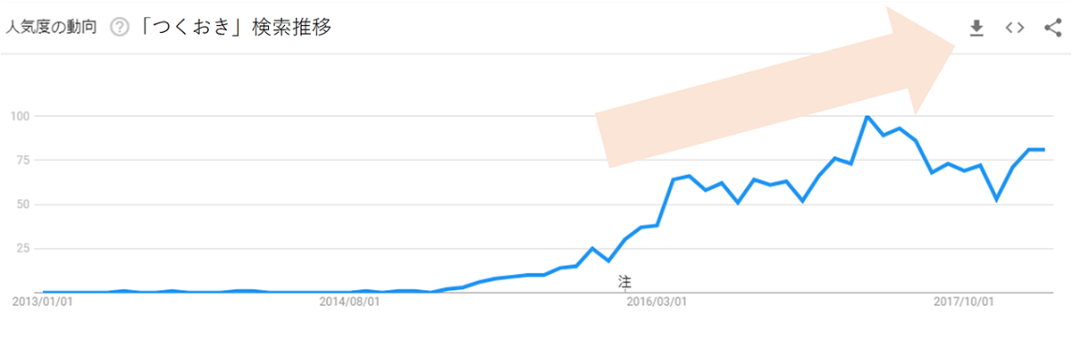 「労力の週末貯金」のわかりやすく、象徴的な例は常備菜の「つくりおき」ではないでしょうか。「つくおき」で検索をしてみると、ここ数年で検索数は大きく増加しています。