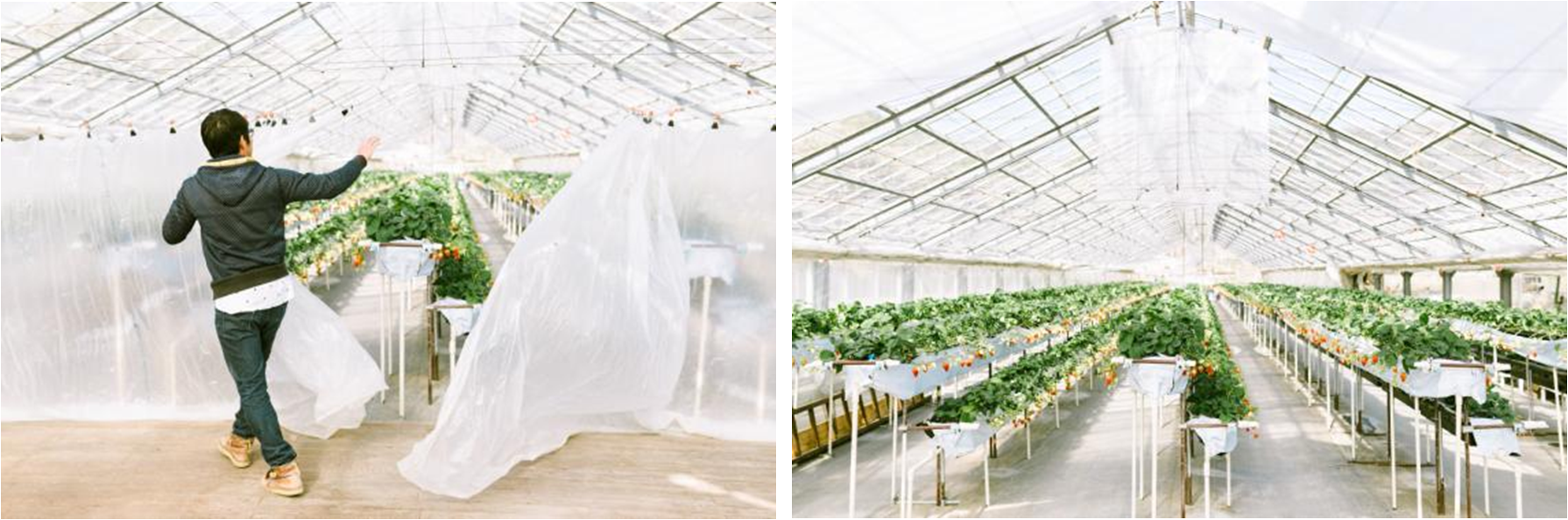 早速ですが、いちごを食べてみますか?カーテンの奥です。お客さんが来るときは少しご挨拶してから開けるんですが、今日は早速開けちゃいましょう。