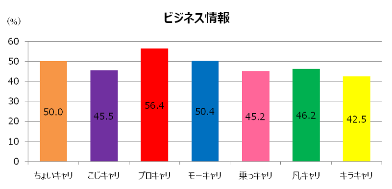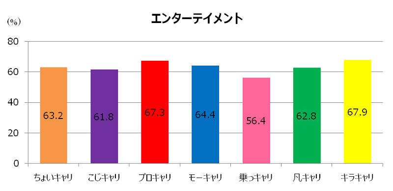 これもやはり予想通りでしょうか、キラキラ系キャリジョのキラキャリがトップです。常に話題をおさえておきたい彼女達にとってWEBでの情報収集はかかせないものなのかもしれません。次いで僅差でエンタメに興味があるのが、ちょっと意外なプロキャリ。仕事だけの真面目人間ではないのかも!?