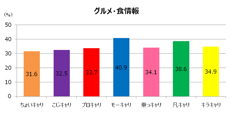 「グルメ・食情報」のジャンルが最も多いのは、モーキャリ。交友関係が広く消費にも積極的な彼女達だからこそ、外食の機会も多くてWEBサイトでの情報収集機会が多いのかもしれません。