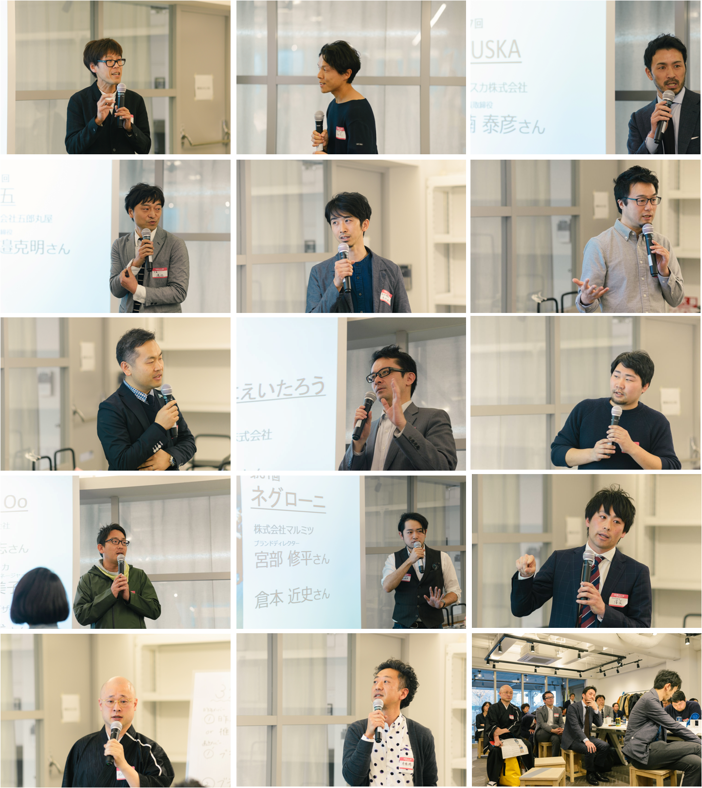 当日お集まりいただいたのは、これまで訪ねたブランドのうち、「hibi(ヒビ)」「HAPPY NUTS DAY(ハッピーナッツデイ)」「KUSKA(クスカ)」「T五(ティーゴ)」「フロートレモンティー/フロートナツミカネード」「めぐる」「PENTA(ペンタ)」「からだにえいたろう」「EVERY DENIM(エブリデニム)」「Hirali(ひらり)」「ネグローニ」「HOTOKI(ホトキ)」「SHUHALLY(シュハリ―・近日公開予定)」「マルサバルーン(近日公開予定)」計14のブランドの担い手さんたち。