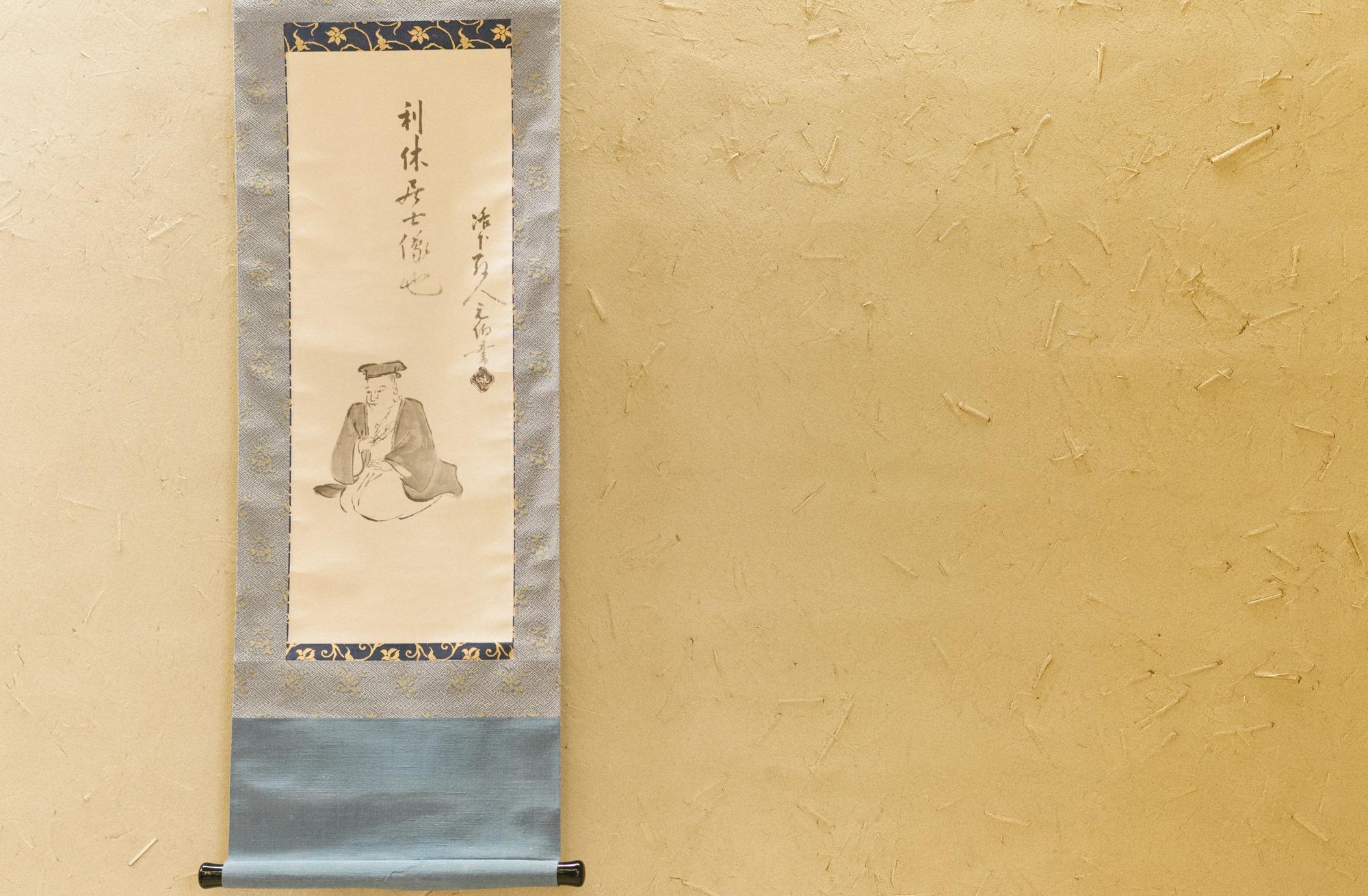 その後、室町幕府の将軍達が好んで茶会を開くようになりますが、中でも一番の転換期は、千利休が登場した時代です。実は明日(取材は2月27日に行われたので、翌日の28日)、利休さんの命日なんですよ。なので、今日の掛け軸も利休さんのお孫さんが「おじいちゃんはこんな感じだったよー」と描いたものにしています。