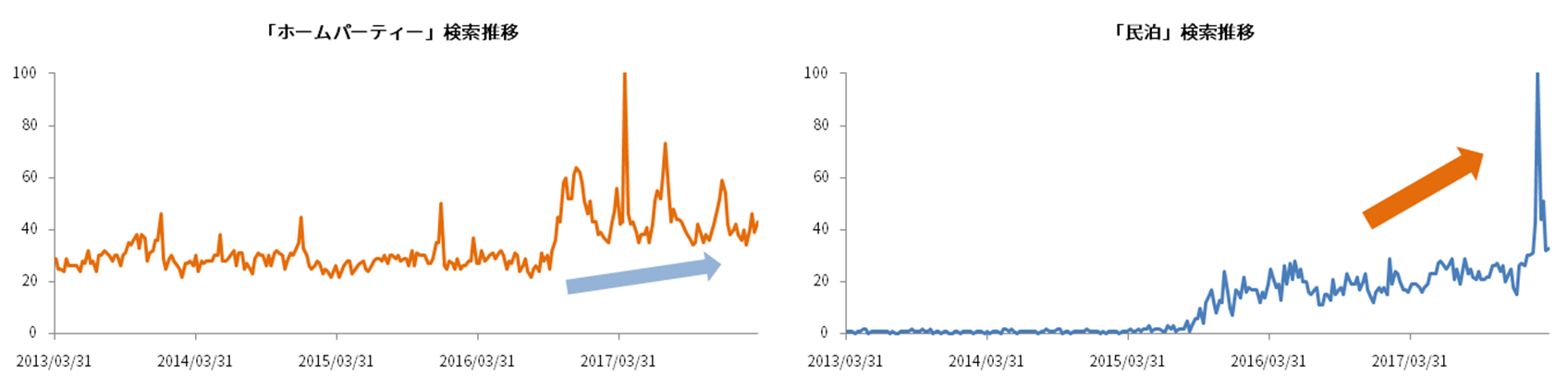 ちなみに、「民泊」の直近の検索数の急増は、3月15日に民泊新法にもとづく届出申請の受付が開始された影響だと考えられます。このように民泊自体、2020年の東京五輪に向け、国のバックアップのもと、ますます盛りあがっていくと思われます。