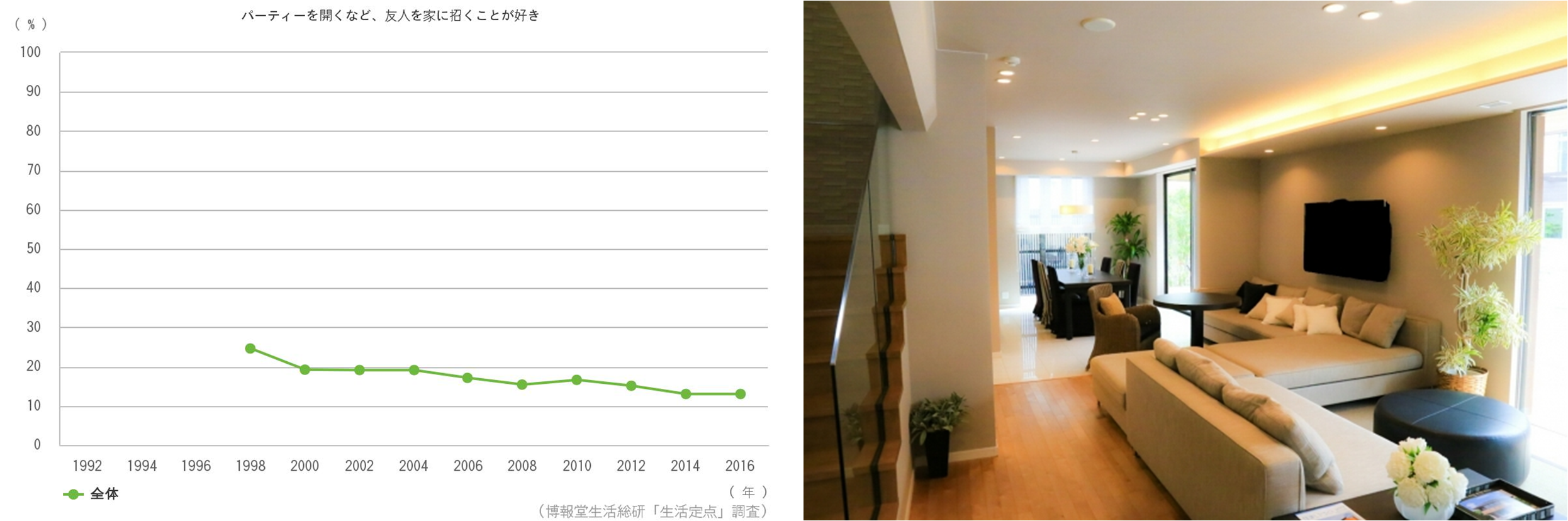 2つ目は、物理的な側面以外に、意識の面でも自分の部屋に人を呼びたくないという人が増えていることです。首都圏と関西エリアでの調査にはなりますが、博報堂生活総合研究所の生活定点で見ても、「パーティーを開くなど、友人を家に招くことが好きな方だ」と答えた人はここ10年減少し続けています。(左下図)携帯・スマートフォンの普及でいつでもだれとでもつながるようになって以来、最後のパーソナルスペースとしての自室を守りたいという人が増えているのではないかと思います。