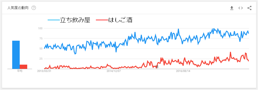 他にも、先述した「立ち飲み屋」に関連するものとして「はしご酒」の検索件数を調べたところ、「立ち飲み屋」と同じような伸びをみせていました。