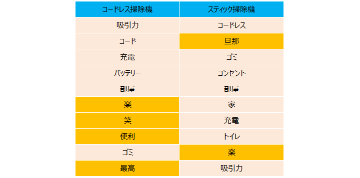 因みに、「コードレス掃除機」「スティック掃除機」でそれぞれ、どのような内容の投稿がされているのかをみるために、共起語(「コードレス掃除機」「スティック掃除機」とともにどのような単語がTwitterで投稿されているか)を調べてみました。