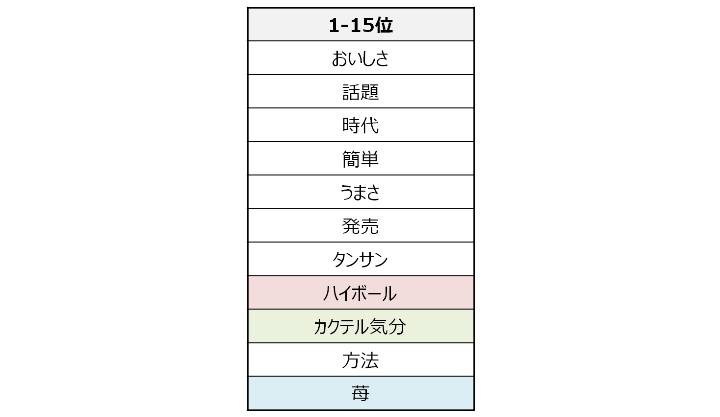 さらには、SNS上に発信しやすい、ということが影響しているかもしれませんが、「果物やアイスと組み合わせて、デザート感覚で楽しむ」も多く見られました。上記の「苺」は、まさにこの内容で、苺を凍らせて炭酸水で割る飲み方が拡散していました。働き方改革の影響で、夜に自宅に早く帰るようになり、アレンジする時間が増えていることも影響しているのかもしれません。