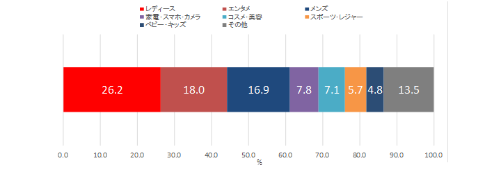 そんなフリマアプリですが、主にどのような商品が売買されているのでしょうか?フリマアプリ大手の「メルカリ」の発表によると、レディースファッションとメンズファッションが4割以上を占めていました。やはり中心になるのは、服やアクセサリー等のファッション商品なようです。