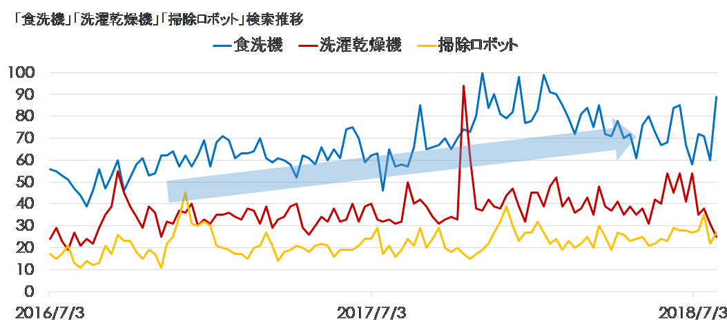 おなじみのGoogle トレンドで食洗機、洗濯乾燥機、掃除ロボットの検索数を見てみると、検索数自体の差はあるものの、直近3年間でどのキーワードも上昇傾向にあり、普及しているとはいえ、今後さらにニーズが拡大していくと思われます。