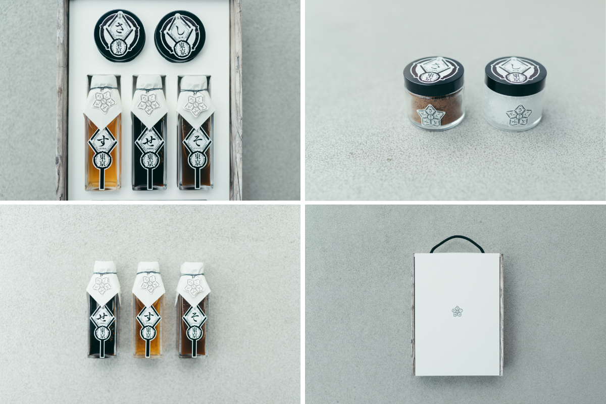 2013年に生まれた「東京さしすせそ」は、東京にある老舗メーカー5社でつくられた砂糖、塩、酢、醤油、ソースを、統一デザインでパッケージ化した調味料セット。料理の味付けの基本である「さ=砂糖」「し=塩」「す=酢」「せ=醤油」「そ=味噌」ですが、こちらは江戸前寿司、天ぷら、佃煮、もんじゃ焼きなど東京の味を支えてきた”さしすせそ”を伝えるため「そ」は味噌ではなくソースを提案しています。“東京の新しいお土産”として贈答品や引き出物として広がりをみせる一方、デザイン面でも世界のデザインコンテストを受賞など、注目を集めています。