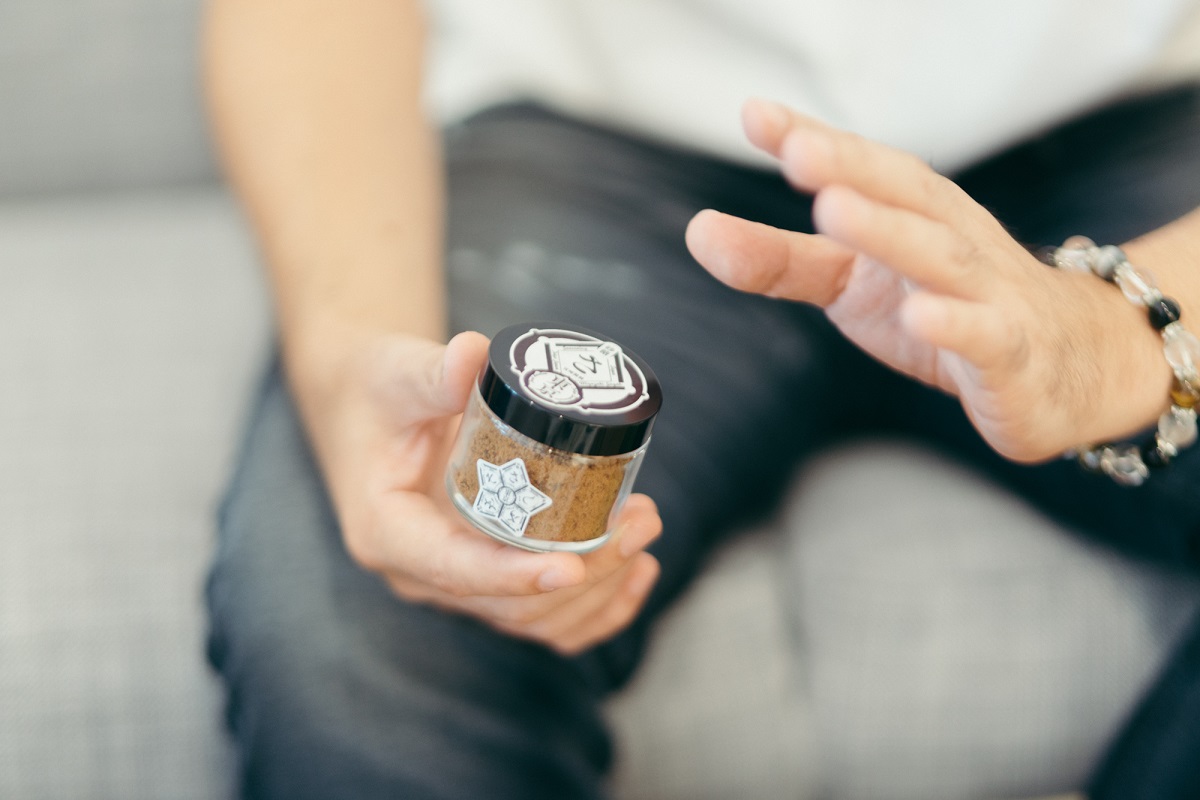 栗尾:化粧品用の瓶は、食品の瓶の単価では厳しいのですが色んな努力と工夫でなんとか…おかげでちょっと重厚感も出せたと思います。この蓋も特注品です。タグ、かぶせ紙やパッケージ箱など、すべて手作業で行っているので1セットつくるのが大変で。最初は多く製造できませんでした。また、お金をかけたPRなども一切行いませんでした。