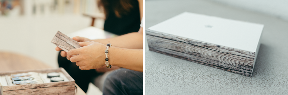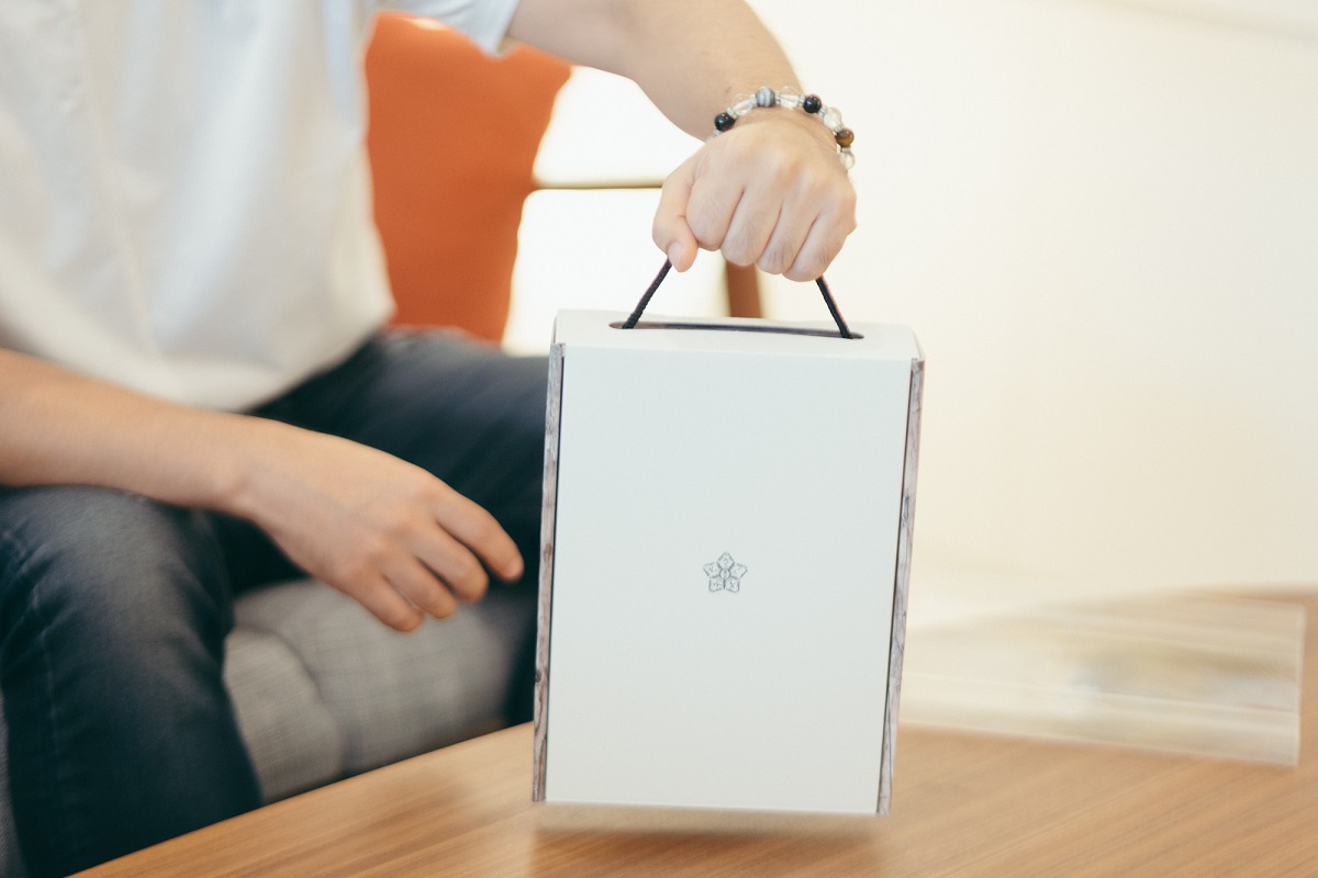 栗尾:配置するときに、この箱を3~4つ重ねると木目がきれいにみえるようになっています。木は強くて自然のもので落ち着きますし、日本の象徴かなと思います。海外発送のときにパッケージの仕切りが破けてしまったこともあって、ロットを組むときも運搬中に箱に負荷がかからないように並べ方も考えています。