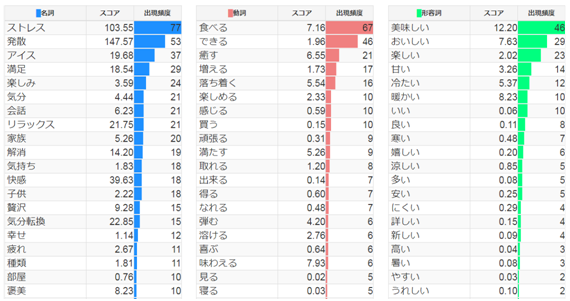 左の列の「名詞」ランキングのトップに「ストレス発散」とあり、更に下を見ると「リラックス」「気分転換」「疲れ」「褒美」などが見られます。そこから推察するに、冬にアイスを食べるということ自体が、非日常的でギャップのある行為であり、それが仕事や家事などで溜まった疲れを癒してくれる役割になっているのでしょう。また、「家族」「部屋」「子供」「会話」なども見られることから、寒い冬なので自宅にいる時間も長い中で、家族と楽しい時間を過ごすためのアイテムになっていることも想像されます。