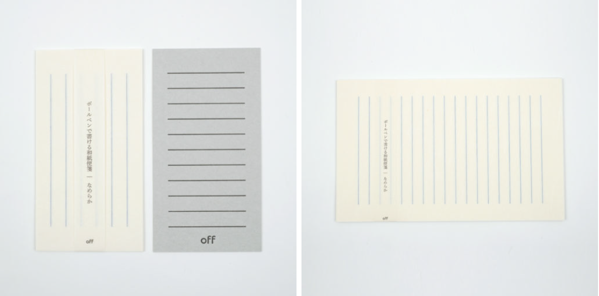 大上:だから「和紙ならこんなものができますよ」という生きた見本がなきゃ説得力がないと思ったんです。この和紙商品をきっかけに、「意外と和紙も使えるな」と見本帳が売り物になるものを作りたくて。それで「OFF」を立ち上げました。オオウエ(O)と船木印刷(F)さんと福嶋賢二さん(F)で、和紙と活版のブランドで「OFF」、あとは肩肘張った場面をONとするなら、気楽に使うことをOFFと捉えようよという、ダブルミーニングで。