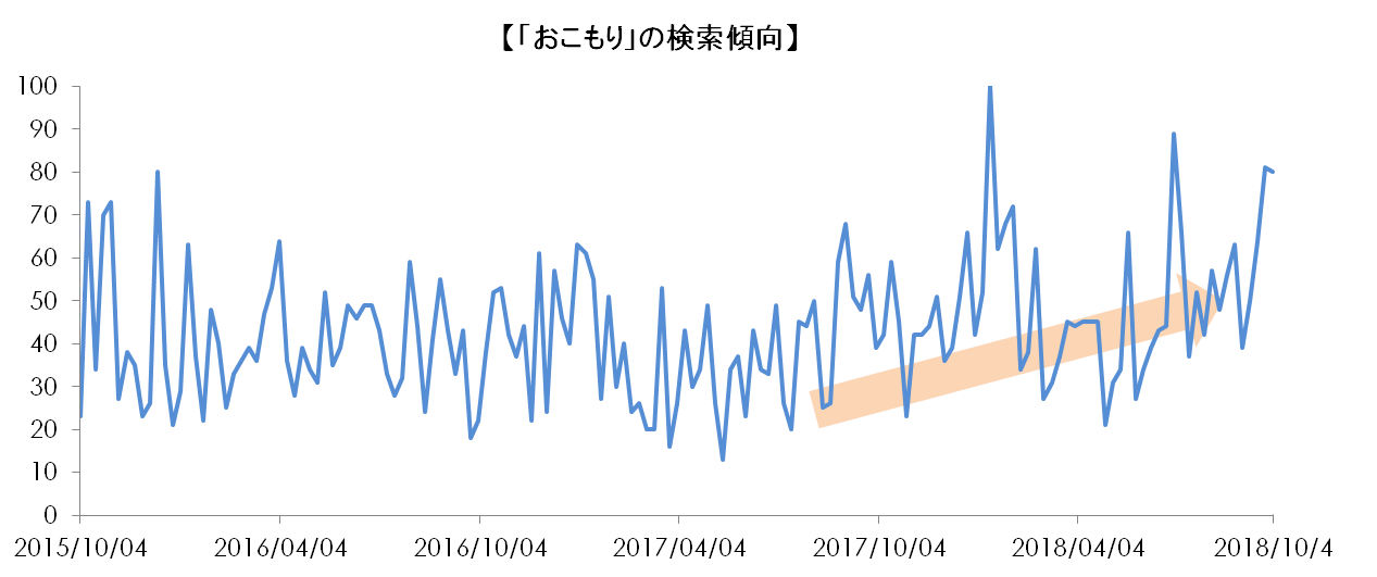 実は、旅先で宿にこもるスタイル自体は、2000年代から旅行業界で「おこもり宿」や「おこもりステイ」として提唱されていましたが、最近になって人気が出てきているようです。googleトレンドで「おこもり」の検索数を見ても、2017年半ばごろから右肩上がりになっているのが分かります。