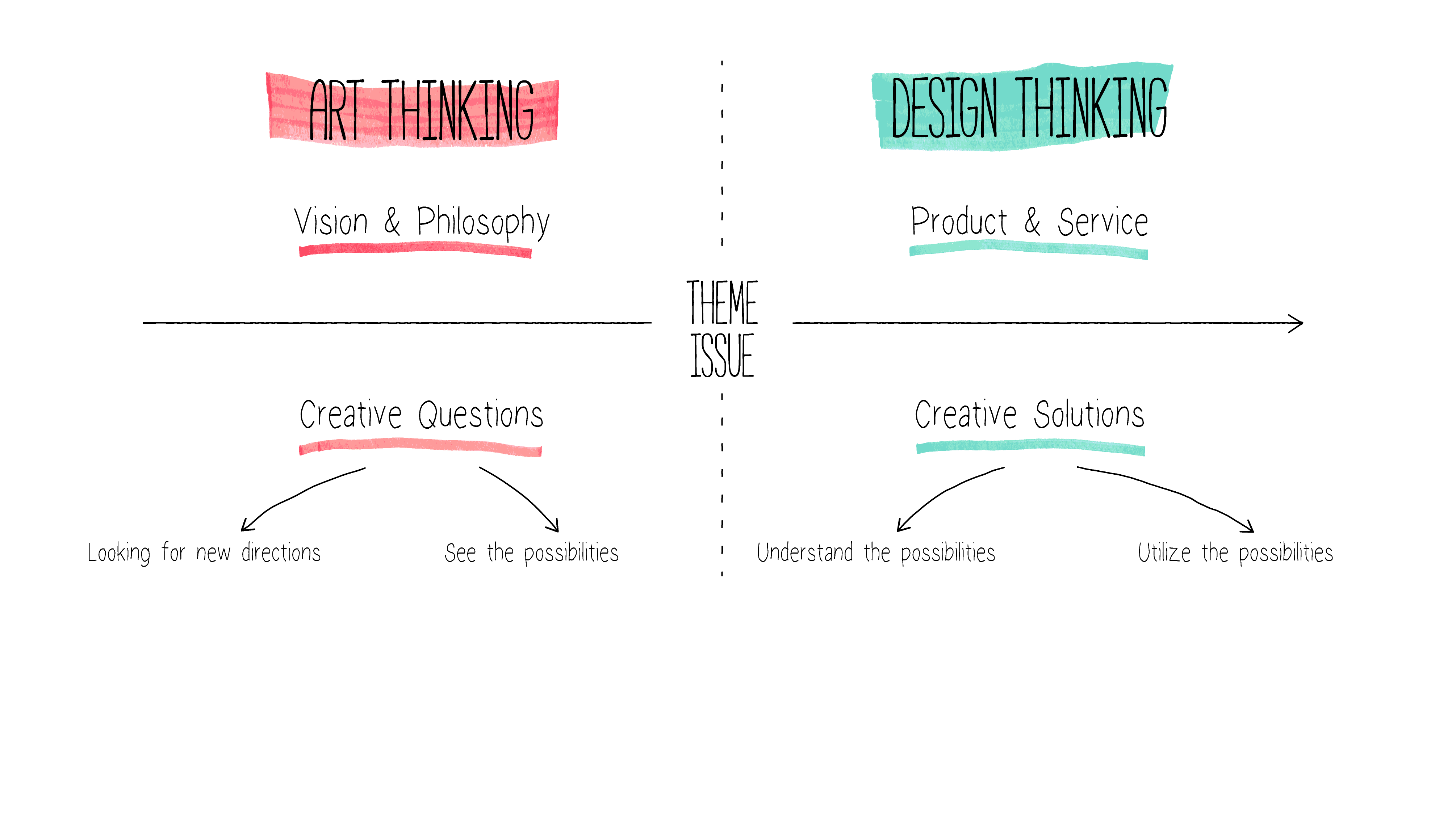 博報堂は、アートシンキングとデザインシンキングが、「真の課題を発見し、発見した課題を解決に導いていく」プロセスにおいて、互いに補完し合うものと考え、セットで提供しています。