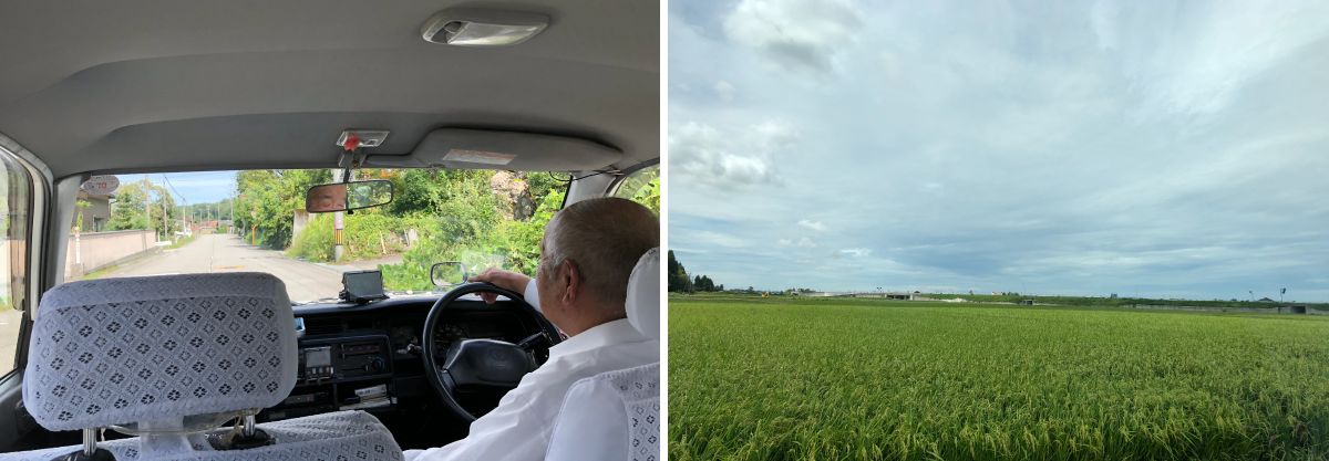 遠慮しがちで笑顔になる運転手さんと、扉を開けて席につく