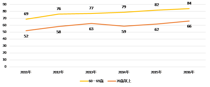 最近、焼肉屋やステーキ屋がシニアで賑わっています。実際、厚生労働省の調査でも60-70代の肉摂取量は年々増えています。