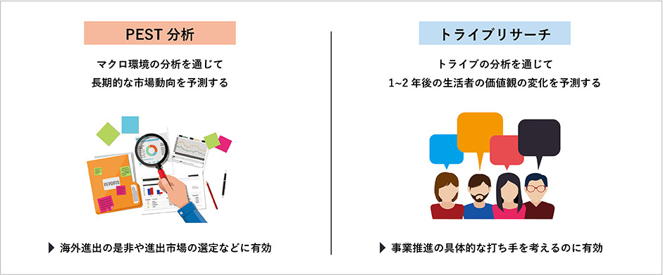 海外市場への進出や現地でのビジネス拡大を考える際に有効な分析手法は、もちろんトライブリサーチだけではありません。PEST分析に代表されるマクロ的な視点からの分析は、長期的な市場動向を見通すことができるため、進出の是非や市場の選定などにおいて従来通り重要であると思います。