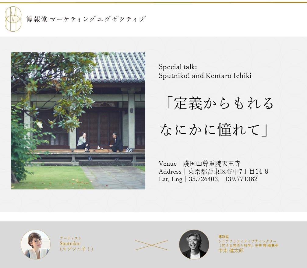 市耒健太郎(以下、市耒) スプツニ子!さん、谷中にお越し頂き、ありがとうございます。今日は特別に、由緒正しい日暮里の天王寺でお話をお願いします。これからの時代に特に大事だと思う「Creativity=創造性」の話を一緒にしたくて、この場所を選んだのですけど、実はこのお寺、歴史は鎌倉時代から750年くらい続いているのに、建物が、寺院建築と現代技法を織り交ぜたRC構造に建て替えていて、コンクリートを型枠に流し込むだけじゃなくて、木造っぽく「組む部材」として建築しているんです。